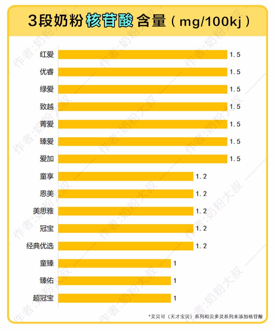 3段配方中,除了艾贝可3段(原名天才宝贝)贝多灵3段没有添加核苷酸之外,其他全部系列都添加了,但含量各有不同,具体如下: