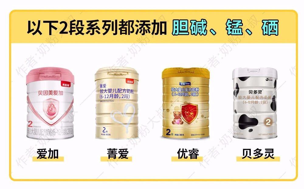 如果纯奶粉喂养的宝宝,可以选择含有这三种营养的配方,这次横评的17个系列奶粉中,2段配方中都添加了胆碱、锰、硒的营养只有4款,分别是爱加2段、菁爱2段、优睿2段、贝多灵2段。