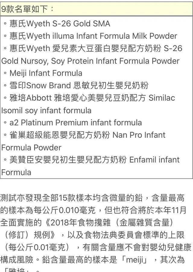 虽然香港食品安全中心曾指出,消费者委员会所参考的欧盟规范只是一种“健康参考值”,并非专门面向婴幼儿配方奶粉的规定,但联合国粮农组织和世界卫生组织的专家委员会参考值却表明,所有涉及的奶粉均未超过限制值。因此,市民可放心依据奶粉包装上的推荐食用重量来喂养婴儿,无需犹豫担心。